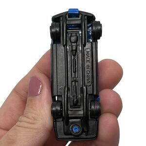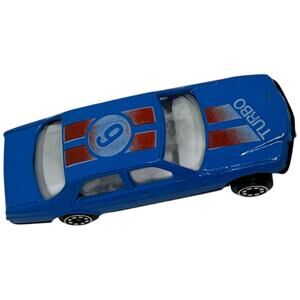 This listing features a vintage diecast toy car in vibrant blue with racing-inspired graphics. The sedan-style vehicle prominently displays "TURBO" on its sides and hood, along with distinctive red racing stripes and a large #9 emblazoned in a blue circle on the roof. Features include clear windows with white interior detailing, black plastic wheels with detailed silver hubs, and authentic sedan styling. The underside shows "MADE IN CHINA" manufacturing mark, confirming its origins. This collectible model appears to be from the 1980s-1990s era and resembles a European sedan modified for racing. Perfect for collectors of vintage miniature cars, racing memorabilia, or nostalgic toys seeking to add a striking blue racer to their collection.