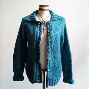 Loving this cottagecore kawaii statement closet staple! Color pop chunky knit cardigan in gorgeous varied aqua teal blue turquoise jewel tone hues. Major preppy boho chic babe does cutie grandma granola girl vibes. Slouchy rolled cuffs, real wood accent buttons! Minimalist colorway and fisherman design for a relaxed cozy look. Soft, stretchy and so so comfy. Mid-weight perfect for layers. Gently used, in excellent vintage condition.
