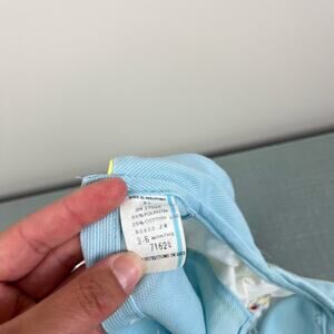 Vintage Blue Teddy Bear Romper. Baby boy size 3-6 months. Short sleeve collared one piece shortall outfit Light blue with yellow and white. Embroidered bear pulling a wagon on the chest. Snaps at the bottom and buttons in the back. Faint marks (see last photo; untreated). Elastic in back of legs is good.