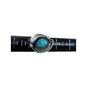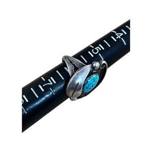 This is an awesome vintage Native American ring made from sterling silver and a lovely veined piece of blue turquoise! The stone is bezel set with a leaf up the side. The craftsmanship is wonderful, with a lot of skilled metal work in the design. It has an artist’s initials in cursive on the back, I’m not exactly sure what they are.