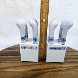 Vintage Blue & White Ceramic Handle 6 Spreader Knives w/ Wood Block, Taiwan
