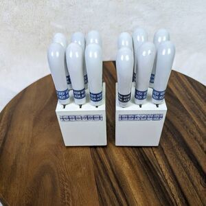 Vintage Blue & White Ceramic Handle 12 Spreader Knives w/ Wood Block, Taiwan