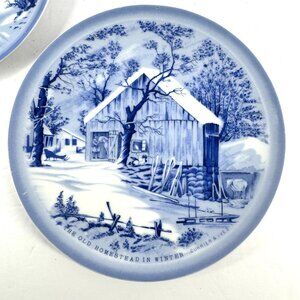 Vintage Blue White Currier & Ives “Old Homestead in Winter” Japan Plate Set of 2