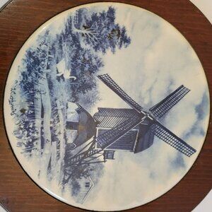 Vintage Blue & White Delft Windmill Ceramic Trivet With Wooden Frame