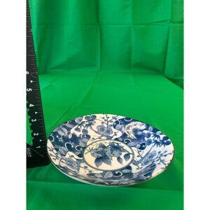 This vintage porcelain plate features intricate blue floral patterns on a white background, adding a classic touch to home decor or tableware.