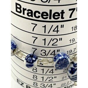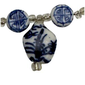 Vintage Blue White Porcelain Bead Bracelet Hand Painted Asian Symbols