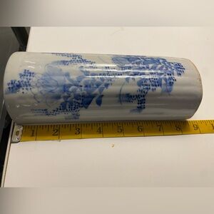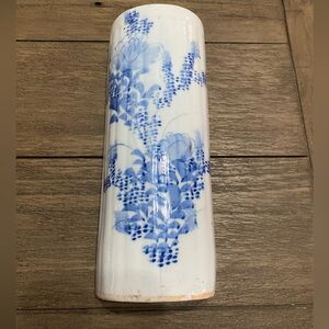 This vintage wall vase features a classic blue and white porcelain design with hand-painted floral motifs. Its tall cylindrical shape and glossy finish evoke traditional Chinese artistry, making it a striking accent for any wall or shelf.