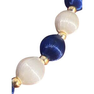 This vintage necklace features a beautiful combination of blue and white silk thread beads complemented by gold-tone spacers. Its 28" length makes it versatile and elegant, perfect for any occasion.