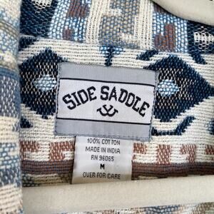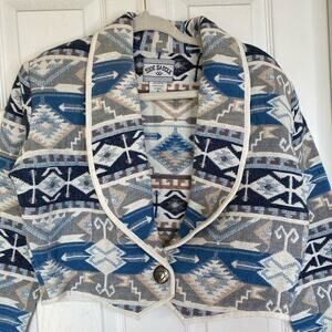 Stylish Vintage blazer with geometric patterns. Features shades of blue and gray. Single button closure. Perfect for a chic look.