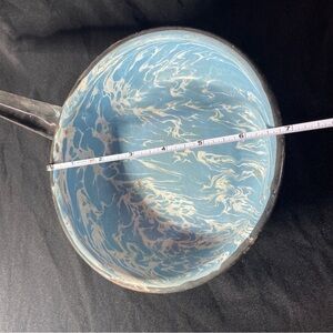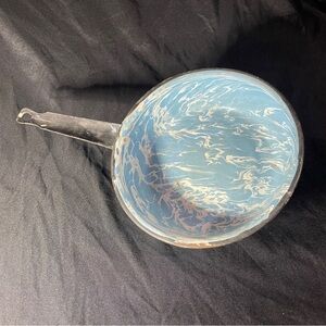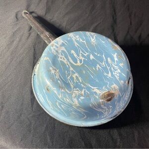 Charming vintage saucepan with a blue and white marbled enamel design. Perfect for adding a retro touch to your kitchen.