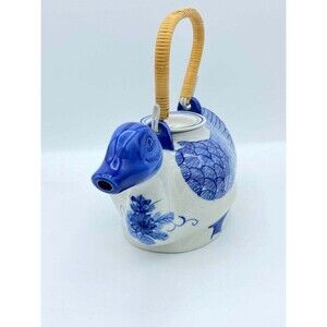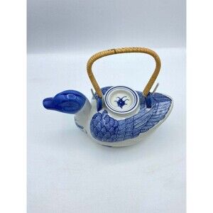 vintage blue and white ceramic duck teapot. It was hand painted in China and it measures approximately 8.5" long x 4" wide x 4.25"