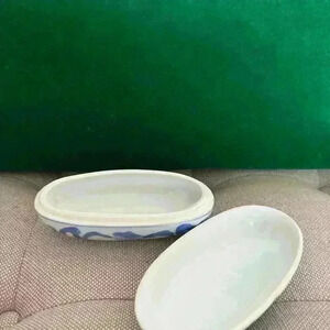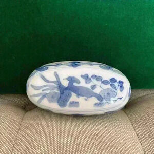 Vintage Blue and White Oval Bird and Floral Motif porcelain Trinket Box. 6 inches in full length, top lid is approximately 5 inches(as shown in image with tape measure). Height is 2 inches. Can be used as a decorative piece or to store jewelry.