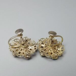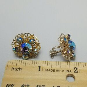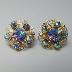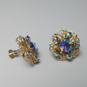 Vintage Blue AB Rhinestone Gold Tone Filigree Screw Back Clip On Earrings Estate