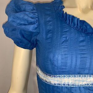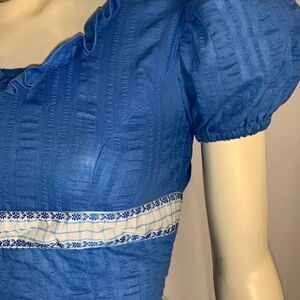 Handmade hand crafted long, blue puff sleeve 1970s Regency dress. Long zipper back closure. Floral embroidered empire waist with tie back waist. Textured soft blue cotton fabric. Elastic band puffy short sleeves. In great vintage condition. No labels please see measurements and photos. No stretch.