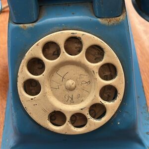 Manufacturer: Steel Stamping Co., Lorain, Ohio Charming vintage rotary phone in a striking blue color. Perfect for collectors or as a unique decor piece.