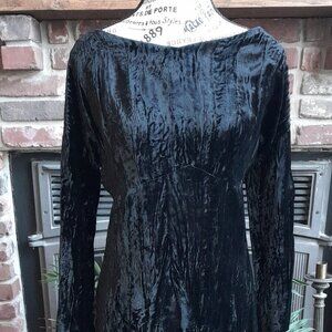 Vintage Bluemarine Crushed Velvet Dress About a Size 8. There is no size tag. This is a gorgeous dress sophisticated and sexy with open back. It is in great condition. The only thing I see is a pull in small part of the zipper in back see photos. Approximate measurements: From top of neck to sleeve 21", Bust 36", Hips 36" . The dress drops from underneath the bus and tapers to about 31" then flairs out again.