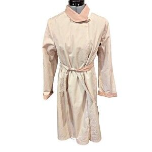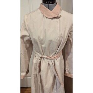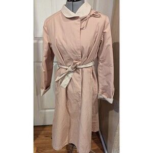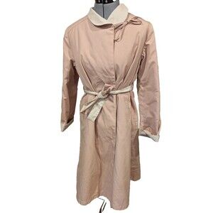 Keywords: vintage trench coat, blush pink coat, belted trench coat, long sleeve coat, collared coat, classic coat, retro coat, womens trench coat, lightweight trench, spring coat, fall coat, outerwear, vintage outerwear