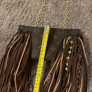 Repurposed authentic Louis Vuitton canvas leather. Purchased from Vintage BoHo bags website. Just too small for me. Faux gold strap added with D-ring, strap length 24” (not adjustable). See all photos for measurements. Can be used as clutch when strap is detached.