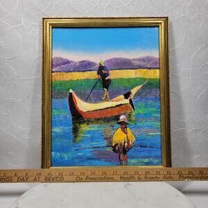 Vintage Boat Fisherman Oil Painting Canvas Framed Art Hanging Decor Signed