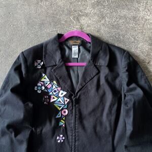 Step back in time with this unique vintage Y2K Bob Mackie jacket! This women's size L black full zip coat features an eye-catching art cottage design with various patches. Perfect for adding a touch of retro flair to your wardrobe. Great for layering or making a statement. Don't miss out on this one-of-a-kind piece! It's in excellent vintage condition and ready for a new home.