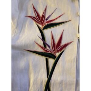 Vintage Bob Mackie Wearable Art Size XL 3/4 Sleeve Linen Blend White Embroidered Bird of Paradise Tunic Pockets Button. Good pre-owned condition. No stains, tears or holes. No stains, tears or holes. There is a snag on sleeve that appears to be part of the linen and not damage. Measurements in photos.