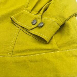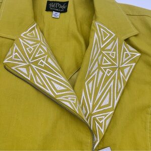 Add a bold vintage statement to your wardrobe with this Bob Mackie Wearable Art jacket in women’s size 2X. Likely from the late 1990s to early 2000s, this moto-style piece features a vibrant chartreuse color and striking white geometric embroidery on the lapels and back. A true collectible from Mackie’s ready-to-wear era.