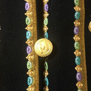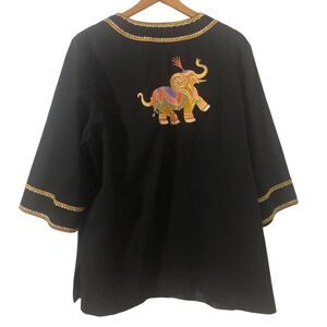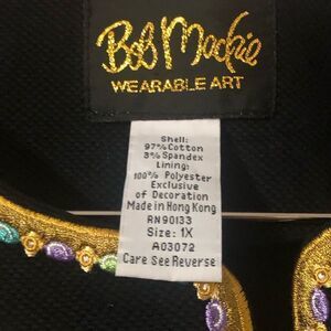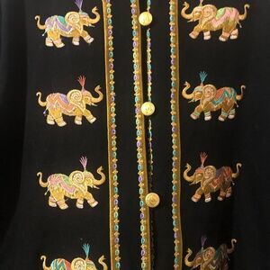 Vintage Bob Mackie wearable art embroidered black tunic jacket. Embroidered elephants on front and back. Gold buttons with letter M on them. 3/4 length sleeves. Shoulder pads. Cotton and spandex. Lining is polyester. Size 1X EUC