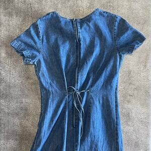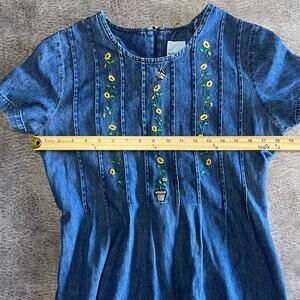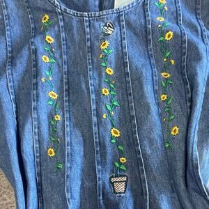 -Vintage denim dress with adorable sunflower embroidery down the front. Features vertical seam detailing for a flattering shape and a back tie detail. Super cute and easy to style for a casual day out or a picnic date.