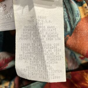 Made in USA. Full button down front. Back has elastic. Hidden hip pockets. Machine washable.