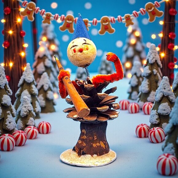 This delightful 1950s Japan bobblehead elf ornament brings mid-century charm to any holiday display. Crafted with a spun cotton head, jaunty pointed hat, chenille arms, and a wooden clarinet, this clown-style elf balances atop a textured pinecone body. A wonderfully expressive piece for Putz villages, mid-century Christmas décor, or collectors of Japanese novelty ornaments.