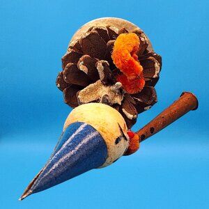 Vintage Bobblehead Elf Ornament Pinecone Body Spun Cotton Chenille Clarinet 50s