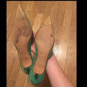 Like new! Vintage item. Stunning Boccaccini green suede slingbacks. Size 39.5 (US 8.5). Worn only once to an indoor wedding. See soles, which show how new these are. Tiny bit of dirt on heels is the only sign of wear. Chic & fabulous, these rack up compliments quickly! Made in Italy. 100% genuine suede & leather.