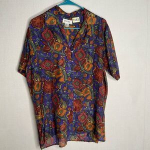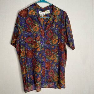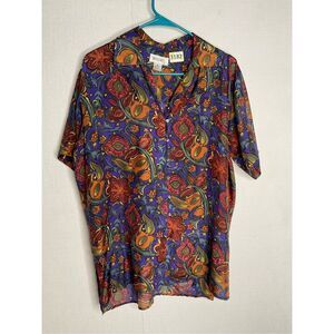 Vintage Bogari Silk Blouse Women’s sz M Purple Orange Floral Loops&Button Shirt