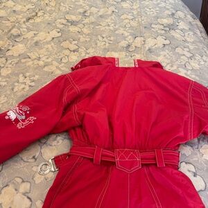 Super fun, lovely Red embroidered vintage women's lined ski suit. All zippers and snaps in good working condition. No Marks, stains or tears. Bogner belt included, some corrosion on the metal. Non smoking house.