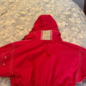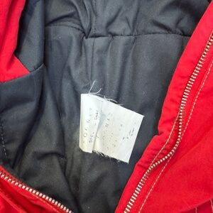 Attached removable, concealable hood. Inner Elastic cuffs. Size on tag is illegible but believed to be a 4.