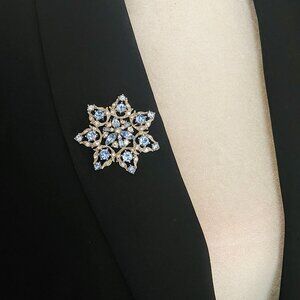 Lovely open work design features light blue and glittering clear rhinestones in a flower design brooch and matching clip back earrings. The setting is shiny silver tone metal.