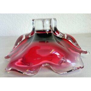 This vintage ruffled-edge Bohemia crystal bowl showcases expert craftsmanship from Czechoslovakia. Its vibrant red hues blend artfully with clear glass, creating a striking centerpiece or collectible.
