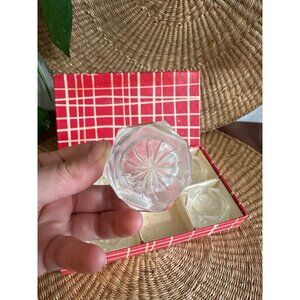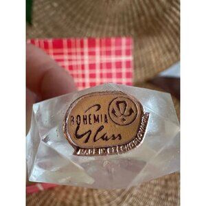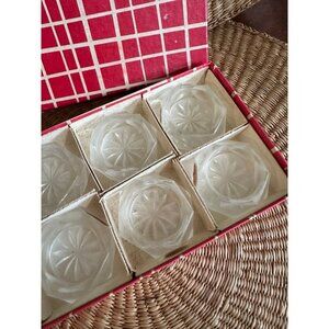 Beautiful set of 6 faceted glass coasters from Bohemia Glass, made in Czechoslovakia. These starburst-cut coasters come in their original red plaid box and feature the original foil label. A lovely collectible set or gift for vintage glassware lovers.