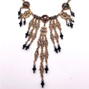 This vintage Bohemian jewelry set from the 1990s features a handcrafted brass filigree necklace paired with matching handmade beaded earrings. The intricate filigree design and natural beads capture a timeless boho-chic aesthetic. In excellent condition, this set is perfect for collectors or anyone seeking a statement vintage ensemble.