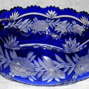 Lovely vintage Bohemian cut to clear cobalt blue crystal bowl. It measures about 4 inches tall and the top is about 8 inches wide at the top opening. Ten inches at the widest part. Perfect condition. Has a gorgeous floral and leaf vine design with a jagged top. Starburst top. Very heavy, quality glass.