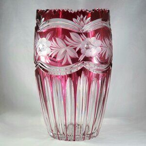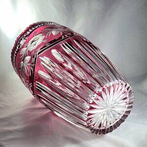 Vintage Bohemian Czech Cranberry Red Cut to Clear Crystal Vase Floral Design 10"