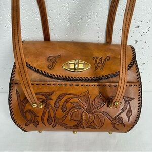 60's 70's Vintage Bohemian Handmade Tooled Leather Satchel Shoulder Bag monogrammed either T or J and W. There is some distressing on the top / front not bad suits the bag in good preowned condition. Gold hardware twist lock closure 2 outside pockets 1 inside pocket