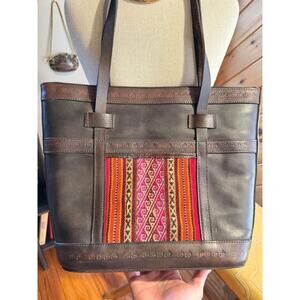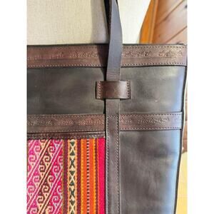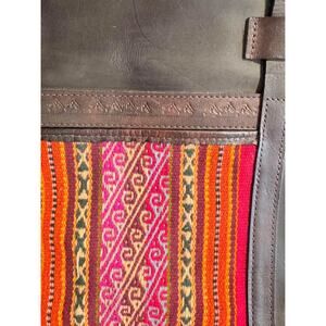 Stunning authentic vintage leather Tote bag made from thick dark brown hand stamped leather and a woven carpet style tapestry on one side. A gorgeous vintage piece for your wardrobe, has a very vintage bohemian feel. Zip closure. In great vintage condition.