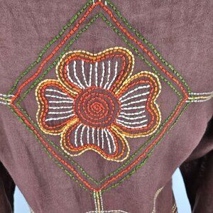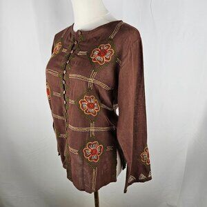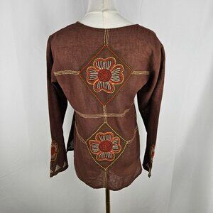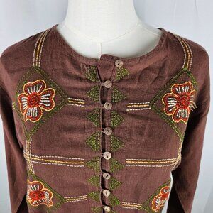Vintage Bohemian Top Size Small Brown Embroidered Button-Up Brown Artsy Hippie