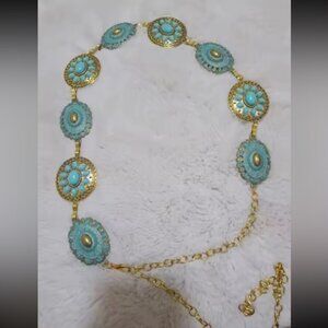 Chic belt with turquoise accents. Gold chain adds elegance. Perfect for any outfit.