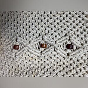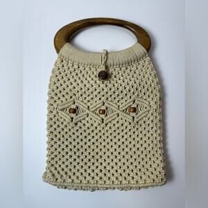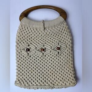 Vintage Bohemian Wood Oval Handled Wood Bead Accent Cream Macrame Hand Bag
