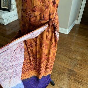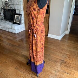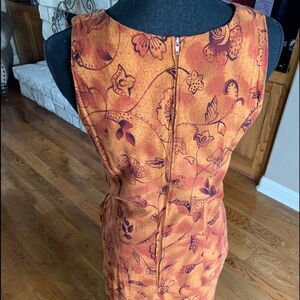80’s sleeveless floral print dress warp ties at the waist back zipper closure lightweight unlined -no pockets rust/burnt orange geometric print on hemline color may vary due to lighting great preloved condition smoke/pet free home