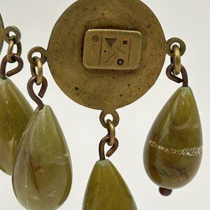 Pair 1: Brass-tone sunburst tops with purple cabochon, green teardrops, 3.5-4 inches long. Signed with abstract symbol hallmark on reverse.