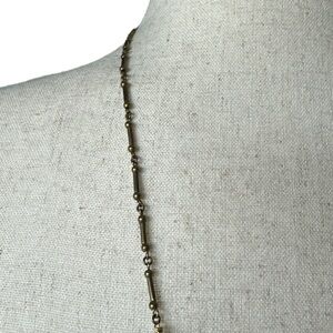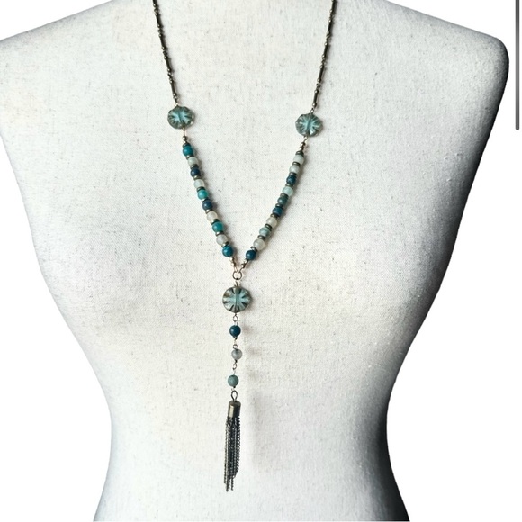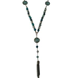 This stunning vintage-inspired lariat necklace features beautiful turquoise and gold-tone beads, accented with intricate floral medallions and a dangling chain tassel pendant. With its boho-chic style, this necklace is perfect for layering or wearing alone as a statement piece.