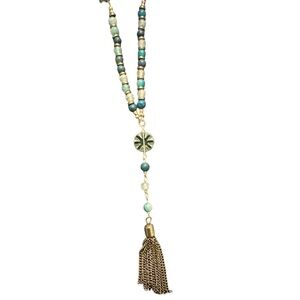 Vintage Boho Beaded Lariat Necklace | Turquoise & Gold Tassel Pendant